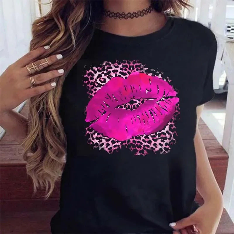 Unleash your wild side with this trendy Women's Leopard Lips Graphic T-Shirt! Featuring a bold pink leopard print kiss lips design that's sexy, fun, and full of attitude – perfect for making a statement.